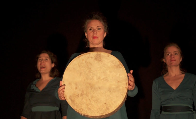 Trois comédiennes y font apparaître des décors et construisent des contes en direct